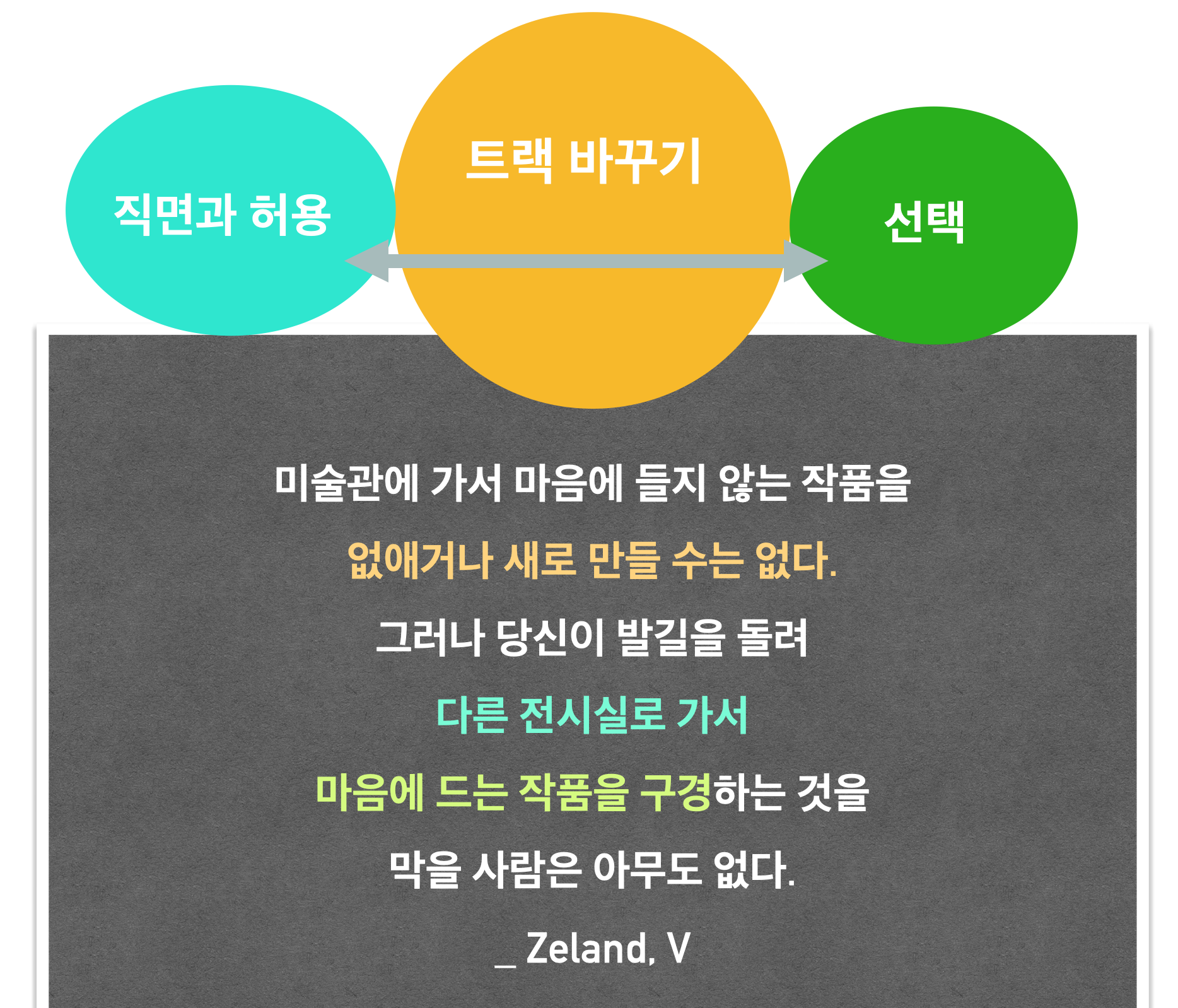 미술관에 가서 마음에 들지 않는 작품을 없애거나 새로 만들 수는 없다. 그러나 당신이 발길을 돌려 다른 전시실로 가서 마음에 드는 작품을 구경하는 것을 막을 사람은 아무도 없다.