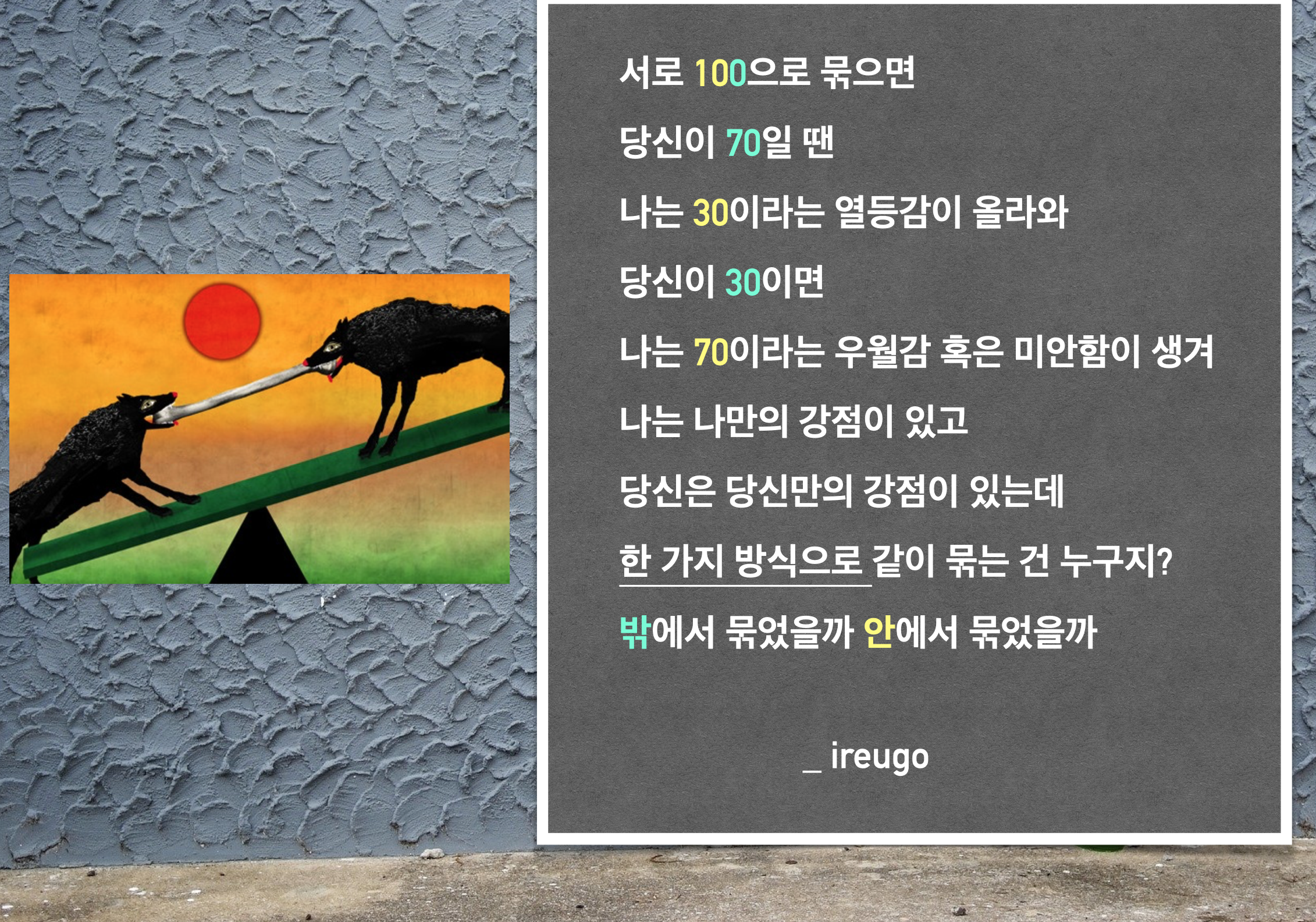 서로 100으로 묶으면 당신이 70일 땐 나는 30이라는 열등감이 올라와 당신이 30이면 나는 70이라는 우월감 혹은 미안함이 생겨 나는 나만의 강점이 있고 당신은 당신만의 강점이 있는데 한 가지 방식으로 같이 묶는 건 누구지? 밖에서 묶었을까 안에서 묶었을까