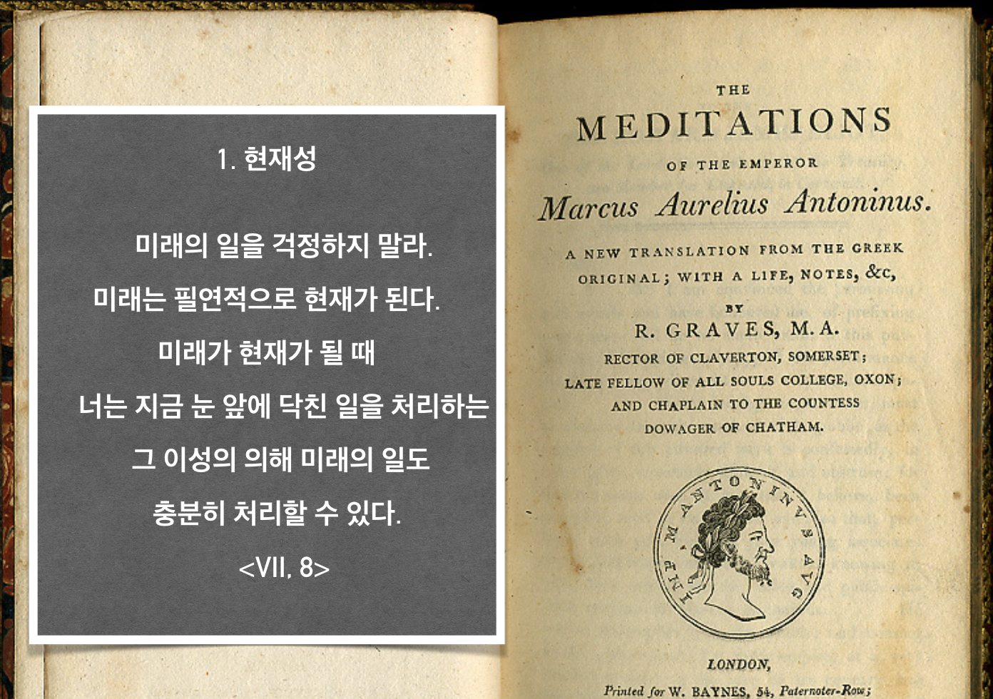 《명상록》에 보면 이 “현재성”에 대한 이야기가 끊임없이 나옵니다. 아우렐리우스는 에픽테토스로부터 담화록을 배웠죠. 그러면서 이 현재성에 눈 뜬 겁니다. 내게 달린 것과 그렇지 않은 것에 대한 선별, 바늘 끝에 선 것과 같은 전쟁터에서... 신에게 과감하게 내어맡기면서도 누구보다 치열하게 현재를 살아낸 거죠.