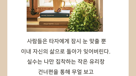 사 람들은 타자에게 잠시 눈 맞출 뿐 이내 자신의 삶으로 돌아가 잊어버린다. 실수는 나만 집착하는 작은 유리창 건너편을 통해 무얼 보고 배웠는지만 잊지 않으면 돼.